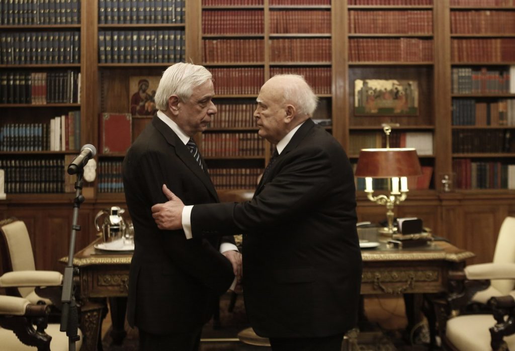 Αποτελεί για μένα εξαιρετική τιμή το γεγονός ότι σας διαδέχομαι στην Προεδρία της Δημοκρατίας ύστερα από την ψήφο του Κοινοβουλίου. Γνωριζόμαστε από παλιά. Έχουμε διανύσει κοινές πορείες και μοιραζόμαστε κοινές αγωνίες. Και εκείνο που κρίνω σημαντικό -και σας το οφείλω όχι μόνον ως Πρόεδρος της Δημοκρατίας, αλλά και ως Έλληνας πολίτης- είναι να σας αναγνωρίσω ότι ασκήσατε τα καθήκοντά σας κατά τρόπο άψογο, ιδίως την τελευταία περίοδο της οικονομικής κρίσης, όταν κληθήκατε να διασφαλίσετε την λειτουργία των θεσμών στο όριο του Συντάγματος, όπως είχαμε την ευκαιρία να συζητήσουμε πολλές φορές με την άλλη μου, την ακαδημαϊκή, ιδιότητα, χωρίς να φανταζόμουν ποτέ ότι θα χρειαζόταν να το αποδείξω και στην πράξη. Και αυτό είναι εξαιρετικά σημαντικό: Να αποχωρεί κανείς από την Προεδρία της Δημοκρατίας με αυτά τα εφόδια, αυτή την αναγνώριση, αυτή την υστεροφημία.