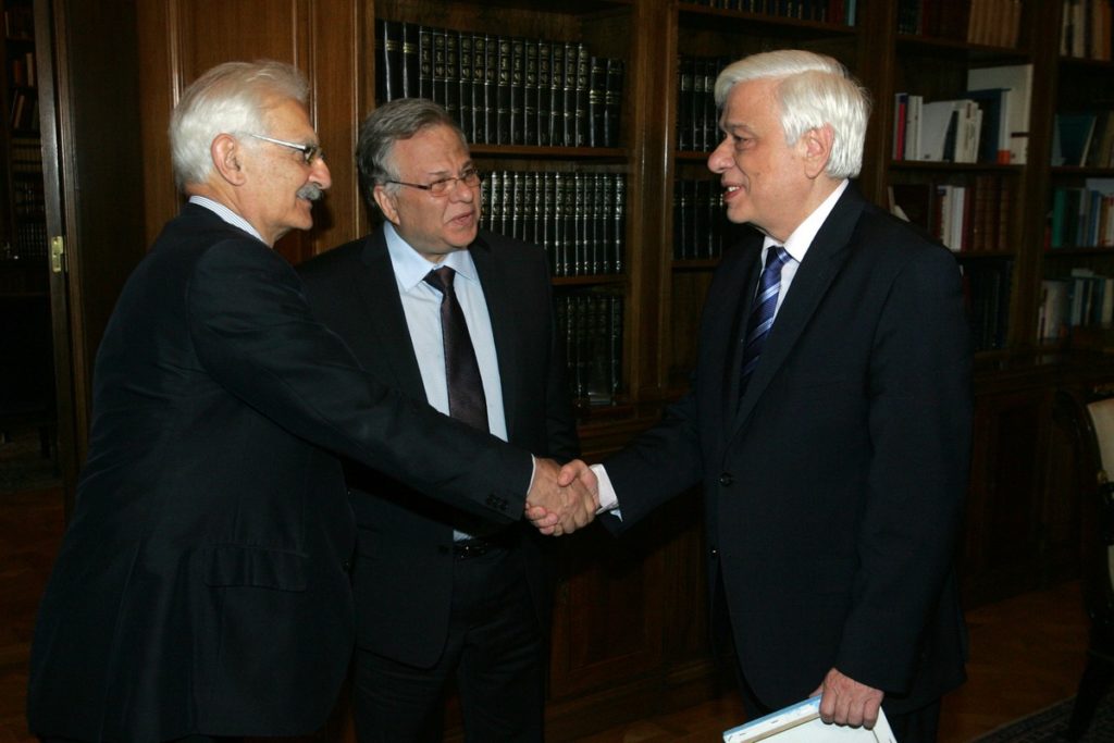 Ï Ðñüåäñïò ôçò Äçìïêñáôßáò Ðñïêüðçò Ðáõëüðïõëïò (Ä) õðïäÝ÷åôáé ôïí ðñüåäñï ôïõ "×áìüãåëïõ ôïõ Ðáéäéïý" Êùíóôáíôßíï Ãéáííüðïõëï (Ê) êáé ôïí áíôéðñüåäñï Êùíóôáíôßíï Êïôóéëßíç (Á) óôç óçìåñéíÞ ôïõò óõíÜíôçóç óôï Ðñïåäñéêü ÌÝãáñï, Ôñßôç 12 Ìáúïõ 2015. ÁÐÅ - ÌÐÅ/ÁÐÅ - ÌÐÅ/ÁëÝîáíäñïò ÌðåëôÝò