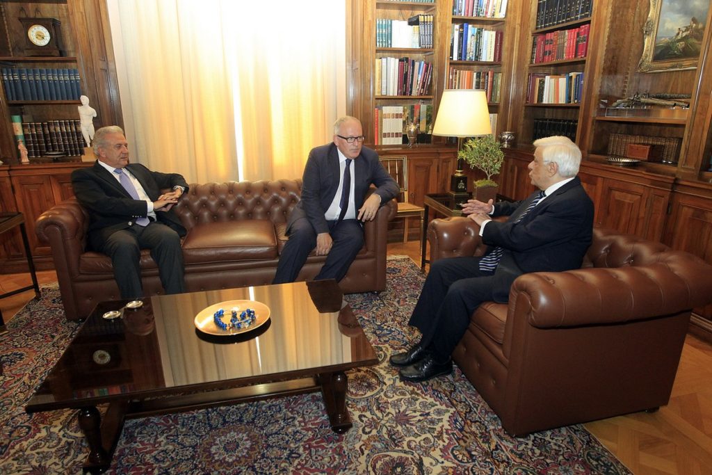 Από τη συνάντηση του Προέδρου της Δημοκρατίας κ.Προκόπη Παυλόπουλου με τον A΄ Αντιπρόεδρο της Ευρωπαϊκής Επιτροπής κ.Frans Timmermans, ο οποίος συνοδευόταν από τον αρμόδιο Επίτροπο για την Μετανάστευση, Εσωτερικές Υποθέσεις και Ιθαγένεια Δημήτρη Αβραμόπουλο
