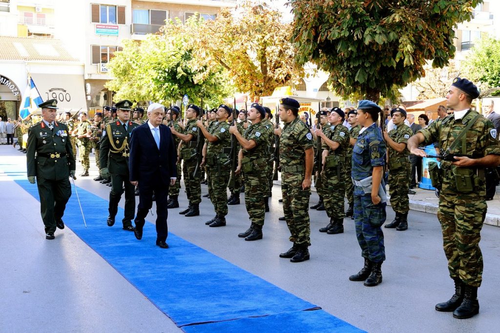 Ο Πρόεδρος της Δημοκρατίας, Προκόπης Παυλόπουλος επιθεωρεί στρατιωτικό άγημα, την Κυριακή 27 Σεπτεμβρίου 2015, στην Τρίπολη. Με την παρουσία του Προέδρου της Δημοκρατίας Προκόπη Παυλόπουλου τελέστηκαν σήμερα οι εορταστικές εκδηλώσεις για την 194η επέτειο άλωσης της Τρίπολης από τον Θεόδωρο Κολοκοτρώνη και τους επαναστατημένους Έλληνες, στις 23 Σεπτεμβρίου 1821, σηματοδοτώντας την απαρχή του νεότερου Ελληνικού κράτους. Το πρωί τελέστηκε στον καθεδρικό ιερό ναό του Αγίου Βασιλείου επίσημη δοξολογία, προεξάρχοντος του μητροπολίτου Μεσσηνίας Χρυσοστόμου, όπου παρέστησαν ο Πρόεδρος της Δημοκρατίας, ο υφυπουργός παρά τω Πρωθυπουργό Τέρενς Κουίκ, εκπροσωπώντας την κυβέρνηση, πολιτικοί, και εκπρόσωποι των στρατιωτικών και δικαστικών αρχών της πόλης, του νομούς και της περιφέρειας Πελοποννήσου. Ακολούθησε επιμνημόσυνη δέηση στο μνημείο Αρχιερέων και Προκρίτων, κατάθεση στεφάνου από τον Πρόεδρο της Δημοκρατίας, στον ανδριάντα του Θεόδωρου Κολοκοτρώνη και παρέλαση στρατιωτικών, μαθητικών και πολιτικών τμημάτων. ΑΠΕ-ΜΠΕ/ ΑΠΕ-ΜΠΕ/ ΚΩΣΤΑΣ ΚΟΛΛΙΝΤΖΟΓΙΑΝΝΑΚΗΣ