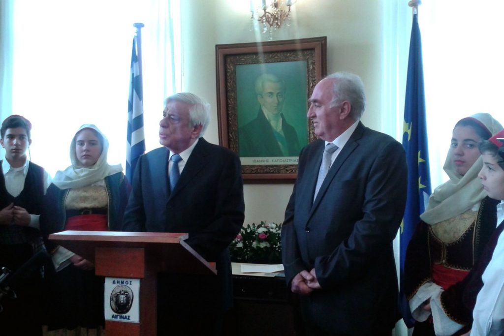 Αποδεχόμενος, ασμένως, την μεγάλη τιμή που μου περιποιείτε ανακηρύσσοντάς με Επίτιμο Δημότη του Δήμου Αίγινας και με την διευκρίνιση ότι συναισθάνομαι πλήρως πως η τιμή αυτή δεν αφορά το πρόσωπό μου, αλλά τον Πολιτειακό Θεσμό τον οποίον, προσκαίρως, εκπροσωπώ, σας διαβεβαιώνω ότι αναλαμβάνω, στο ακέραιο, την ευθύνη να ενεργώ εφεξής και ως θεματοφύλακας της αενάως λάμπουσας ιστορικής μνήμης, η οποία αναβλύζει πλουσίως από την Αίγινα. Στην οποία, με βάση το παρελθόν της αλλά και το μέλλον που της ανήκει, ταιριάζει ο στίχος του Οδυσσέα Ελύτη από το «Άξιον Εστί»: «Αυτός ο τόπος ο μικρός, ο μέγας». Υπό τις συνθήκες αυτές μου είναι αδύνατο να διατρέξω εκτενώς την ιστορική διαδρομή της Αίγινας. Και γι’ αυτό ας μου επιτραπεί να μείνω, μ’ όλο τον κίνδυνο της υποκειμενικής αυθαιρεσίας, σ’ ορισμένους, ευάριθμους, ιστορικούς σταθμούς: