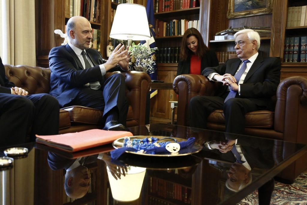 Ο επίτροπος Οικονομικών Υποθέσεων της ΕΕ, Πιερ Μοσκοβισί (Α) μιλάει δίπλα στον Πρόεδρο της Δημοκρατίας Προκόπης Παυλόπουλος (Δ) στο Προεδρικό Μέγαρο, Αθήνα 28 Νοεμβρίου 2016. Διήμερη επίσκεψη στη χώρα μας πραγματοποιεί από σήμερα ο επίτροπος Οικονομικών Υποθέσεων της ΕΕ, Πιερ Μοσκοβισί. ΑΠΕ-ΜΠΕ/ΑΠΕ-ΜΠΕ/ΓΙΑΝΝΗΣ ΚΟΛΕΣΙΔΗΣ