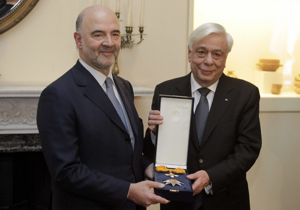 ΠΡΟΕΔΡΟΣ: Κύριε Moscovici, σας απονέμω το Παράσημο του Μεγαλοσταύρου του Τάγματος του Φοίνικος με το εξής αιτιολογικό: Ως Επίτροπος της Ευρωπαϊκής Ένωσης, αρμόδιος για τις Οικονομικές και Δημοσιονομικές Υποθέσεις, έχετε συμβάλει τα μέγιστα ως προς την υπεράσπιση της ενότητας της Ευρωπαϊκής Ένωσης και του σκληρού πυρήνα της, της Ευρωζώνης. Ακόμα και η στάση σας σε ό,τι αφορά την Ελλάδα, στάση πολύ θετική για τη Χώρα μου, εντάσσεται σ’αυτό το πλαίσιο. Διότι αποτελεί κοινή πεποίθηση στην Ευρώπη ότι η διακινδύνευση της θέσης της Ελλάδας εντός της Ευρωζώνης είναι διακινδύνευση της ενότητας της ίδιας της Ευρωζώνης. Επομένως, συμβάλλοντας προς αυτή την κατεύθυνση στην ουσία συμβάλλετε στην ενότητα της Ευρωζώνης και, επομένως, ασκείτε στον ύψιστο βαθμό τα καθήκοντα τα οποία σας έχουν ανατεθεί.