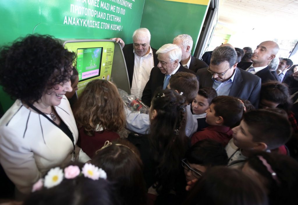 Ο Πρόεδρος της Δημοκρατίας Προκόπης Παυλόπουλος (Κ) δείχνει σε ομάδα παιδιών πως να κάνουν ανακύκλωση στα εγκαίνια του "Πάρκου Περιβαλλοντικής εκπαίδευσης & Ανακύκλωσης" του Δήμου Αγίων Αναργύρων, την Παρασκευή 24 Φεβρουαρίου 2017. ΑΠΕ-ΜΠΕ/ΑΠΕ-ΜΠΕ/ΣΥΜΕΛΑ ΠΑΝΤΖΑΡΤΖΗ