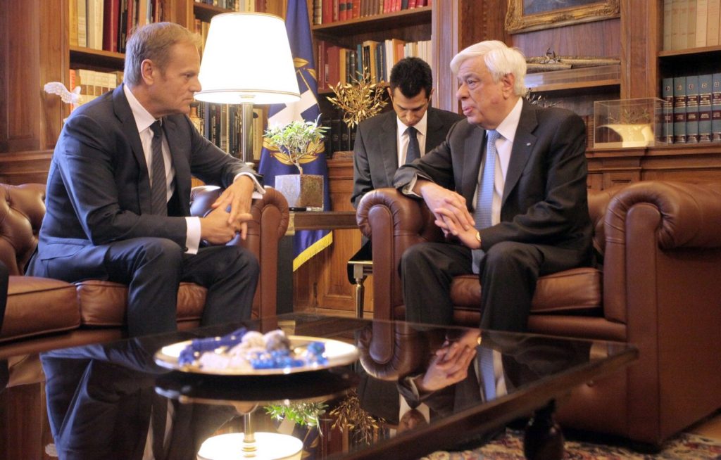 Με ιδιαίτερη χαρά σας υποδέχομαι στην Προεδρία της Δημοκρατίας και σας συγχαίρω εκ νέου για την επανεκλογή σας ως Προέδρου του Ευρωπαϊκού Συμβουλίου, ευχόμενος κάθε επιτυχία στο έργο σας. Η Ελλάδα, το γνωρίζετε καλώς, είναι αποφασισμένη να συμβάλλει, ακόμη και πέρα από το μέτρο που της αναλογεί, προς αυτή την κατεύθυνση.