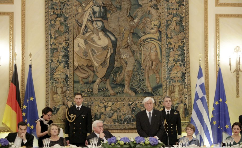 Με ιδιαίτερη χαρά σας υποδέχομαι στην Αθήνα και στην Προεδρία της Δημοκρατίας, υπό την ιδιότητά σας ως Προέδρου της Ομοσπονδιακής Δημοκρατίας της Γερμανίας. Και με την ευκαιρία αυτής της επίσημης επίσκεψής σας στην Ελλάδα επιτρέψατέ μου να σας συγχαρώ, για μιάν ακόμη φορά, αλλά να συγχαρώ και το Εκλεκτορικό Σώμα, το οποίο σας ανέδειξε στο Ύπατο Αξίωμα της Χώρας σας. Και τούτο διότι η εκλογή σας σηματοδότησε, και δη εμβληματικώς, την κορύφωση μιας πραγματικά λαμπρής πολιτικής σταδιοδρομίας, με διεθνείς προεκτάσεις, στο πλαίσιο της οποίας έχετε ήδη συμβάλει καθοριστικώς όχι μόνο στην πορεία της Χώρας σας αλλά και στην πορεία της Ευρωπαϊκής Ένωσης προς την κατεύθυνση της τελικής της ενοποίησης, όπως είναι και ο οριστικός προορισμός της. Δικαίως λοιπόν η Ομοσπονδιακή Δημοκρατία της Γερμανίας μπορεί να επαίρεται ότι τον θώκο του Ύπατου Αξιώματος κατέχει σήμερα ένας κορυφαίος Ευρωπαίος Πολιτικός, με όλη την σημασία των λέξεων.