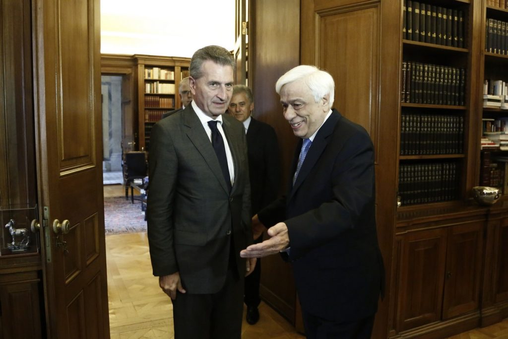 GÜNTHER H. ÖTTINGER: Σας ευχαριστώ πολύ κύριε Πρόεδρε που με δέχεστε σήμερα εδώ στο Προεδρικό Μέγαρο. Επιτρέψτε μου να σας ενημερώσω ότι, είχαμε μια πολύ πλούσια ημέρα σήμερα. Είχα συναντήσεις με τον Πρωθυπουργό, με τον Υπουργό Οικονομικών, με τον Υπουργό Εξωτερικών, με το Κοινοβούλιο και το θέμα το οποίο αφορούσε όλες αυτές τις συναντήσεις ήταν κυρίως το θέμα του Προϋπολογισμού της Ευρωπαϊκής Ένωσης. Εμείς είμαστε σε φάση προετοιμασίας και κατάρτισης του Προϋπολογισμού και μας ενδιαφέρει να ακούσουμε τις απόψεις τις ελληνικής πλευράς.