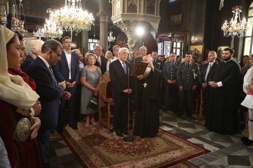Ο Πρόεδρος της Δημοκρατίας, Προκόπης Παυλόπουλος (Κ), παρίσταται στο πανηγυρικό πολυαρχιερατικό συλλείτουργο της Επετείου της Κοιμήσεως της Θεοτόκου και της συμπλήρωσης 150 ετών από τα εγκαίνια του ιερού ναού της "Μεγάλης" Παναγίας, Αγίου Δημητρίου Θηβών, Τρίτη 15 Αυγούστου 2017, ΑΠΕ-ΜΠΕ/ ΑΠΕ-ΜΠΕ/ ΣΥΜΕΛΑ ΠΑΝΤΖΑΡΤΖΗ