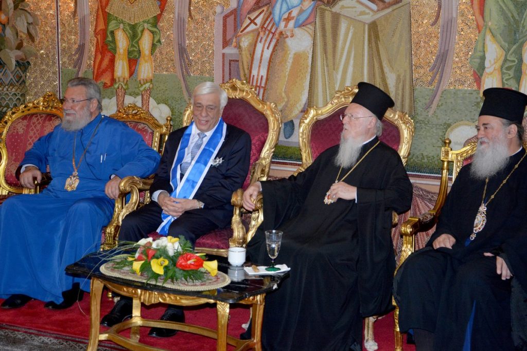 Ο Πρόεδρος της Δημοκρατίας Προκόπης Παυλόπουλος συνομιλεί με τον Οικουμενικό Πατριάρχη Βαρθολομαίο κατά την απονομή του μεταλλίου της Ιεράς Μονής του Αγίου Διονυσίου του εν Ζακύνθω, στον Πρόεδρο της Δημοκρατίας, την Πέμπτη 24 Αυγούστου 2017, στο Αρχονταρίκι στης Ιεράς Μονής Αγίου Διονυσίου. Ο Πρόεδρος της Δημοκρατίας επισκέπτεται τη Ζάκυνθο προκειμένου να παραστεί στον εορτασμό της Επετείου των 300 χρόνων από την Μετακομιδή του Ιερού Λειψάνου του Αγίου Διονυσίου από τις νήσους Στροφάδες στη Ζάκυνθο. ΑΠΕ-ΜΠΕ/ΑΠΕ-ΜΠΕ/ΚΩΣΤΑΣ ΣΥΝΕΤΟΣ