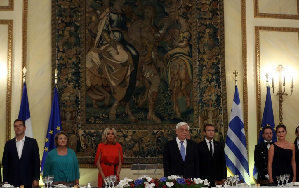 Ο Πρόεδρος της Γαλλίας Εμανουέλ Μακρόν (5Α), ο Πρόεδρος της Δημοκρατίας Προκόπης Παυλόπουλος (4Α), ο πρωθυπουργός Αλέξης Τσίπρας (Α) και οι σύζυγοι τους στο επίσημο δείπνο προς τιμήν του Γάλλου προέδρου, στο Προεδρικό Μέγαρο, Αθήνα Πέμπτη 7 Σεπτεμβρίου 2017. Ο Γάλλος Πρόεδρος βρίσκεται στην Αθήνα σε διήμερη επίσημη επίσκεψη. ΑΠΕ-ΜΠΕ/ΑΠΕ-ΜΠΕ/ΟΡΕΣΤΗΣ ΠΑΝΑΓΙΩΤΟΥ