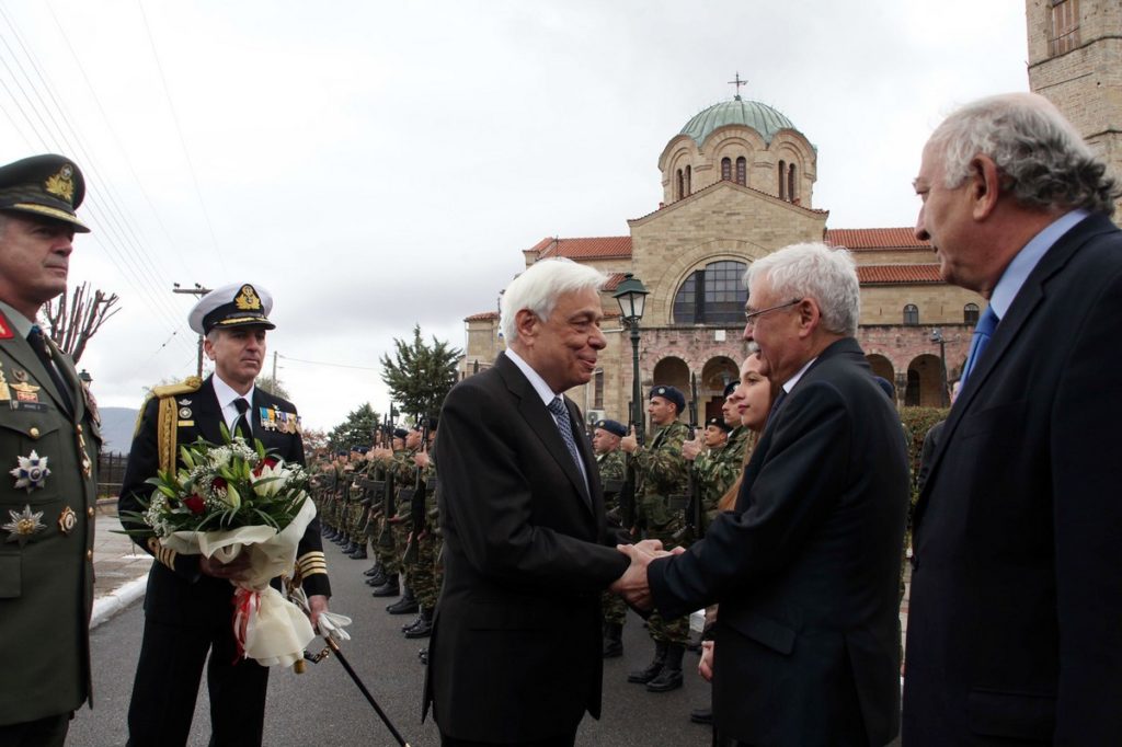 Ο Πρόεδρος της Δημοκρατίας, Προκόπης Παυλόπουλος (Κ) ανταλλάσει χειραψία μετον Δήμαρχο Βοΐου Δημήτρη Λαμπρόπουλο (2Δ) ενώ παρακολουθεί ο υφυπουργός Εξωτερικών Γιάννης Αμανατίδης (Δ), στις εορταστικές εκδηλώσεις για την 105η επέτειο από τη μάχη και την απελευθέρωση της Σιάτιστας, το Σάββατο 4 Νοεμβρίου 2017. Ο Πρόεδρος της Δημοκρατίας παρακολούθησε την Δοξολογία αμέσως μετά κατέθεσε στεφάνι στο μνημείο Ηρώων της πλατείας Τσιστοπούλου και κατόπιν παρακολούθησε την παρέλαση για την 105η επέτειο από την απελευθέρωση της Σιάτιστα. ΑΠΕ-ΜΠΕ/ΑΠΕ-ΜΠΕ/ΔΗΜΗΤΡΗΣ ΣΤΡΑΒΟΥ
