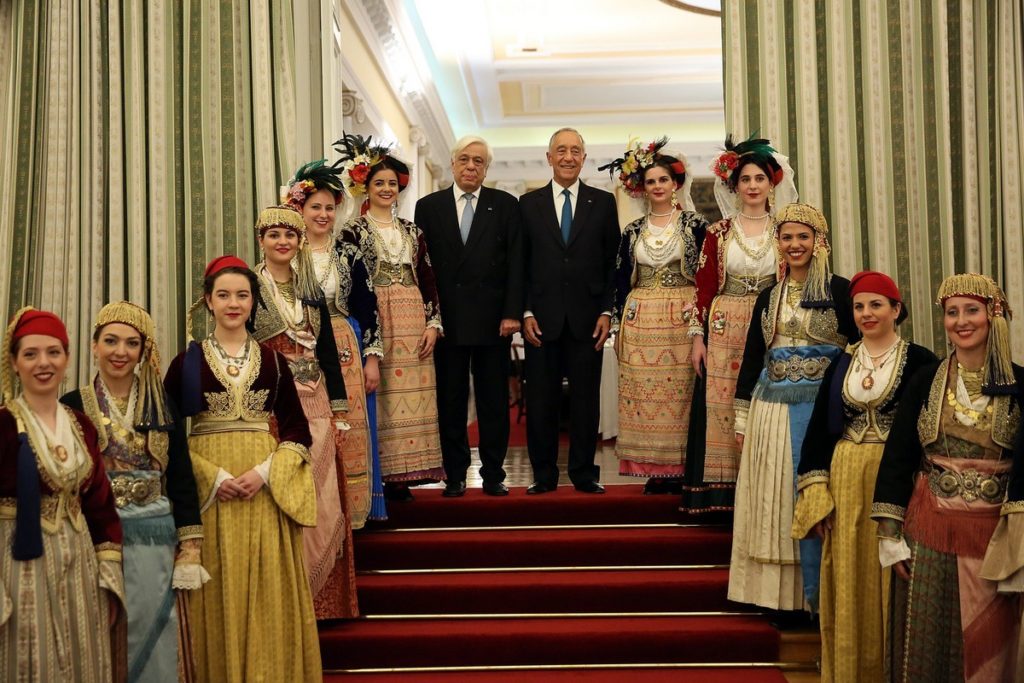 Ο Πρόεδρος της Πορτογαλίας, Marcelo Rebelo de Sousa (ΚΔ), και ο Πρόεδρος της Δημοκρατίας Προκόπης Παυλόπουλος (ΚΑ) φωτογραφίζονται με τις κοπέλες του Λυκείου Ελληνίδων, στο επίσημο δείπνο προς τιμή του Πορτογάλου Προέδρου, στο Προεδρικό Μέγαρο, Αθήνα Τρίτη 13 Μαρτίου 2018. Ο Πορτογάλος Πρόεδρος πραγματοποιεί επίσημη επίσκεψη στην Ελλάδα. ΑΠΕ-ΜΠΕ/ΑΠΕ-ΜΠΕ/ΟΡΕΣΤΗΣ ΠΑΝΑΓΙΩΤΟΥ
