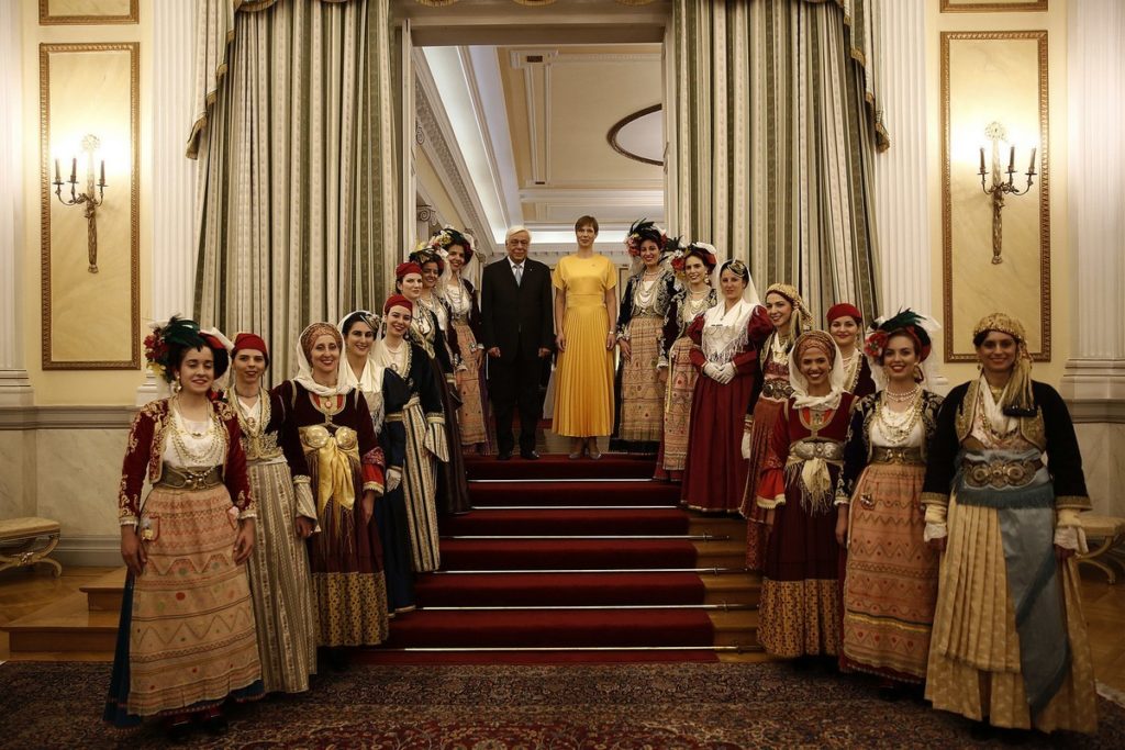 Ο Πρόεδρος της Δημοκρατίας Προκόπης Παυλόπουλος με την Πρόεδρο της Εσθονίας Kersti Kaljulaid φωτογραφίζονται με τις χορεύτριες του Λυκείου Ελληνίδων στο επίσημο δείπνο στο Προεδρικό Μέγαρο, Πέμπτη 17 Μαΐου 2018. ΑΠΕ-ΜΠΕ/ΑΠΕ-ΜΠΕ/ΑΛΕΞΑΝΔΡΟΣ ΒΛΑΧΟΣ