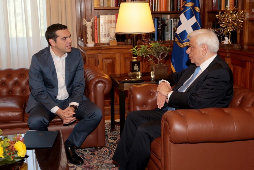 Ο Πρόεδρος της Δημοκρατίας Προκόπης Παυλόπουλος συναντάται με τον Πρωθυπουργό Αλέξη Τσίπρα στο Προεδρικό Μέγαρο, Σάββατο 19 Μαΐου 2018. Ο πρωθυπουργός, Αλέξης Τσίπρας ενημέρωσε τον Πρόεδρο της Δημοκρατίας Προκόπη Παυλόπουλο, για τις εξελίξεις στις διαπραγματεύσεις για το ονοματολογικό της ΠΓΔΜ. ΑΠΕ-ΜΠΕ/ΑΠΕ-ΜΠΕ/Παντελής Σαίτας