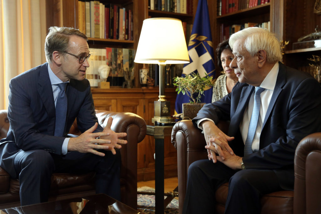 Ο Πρόεδρος της Δημοκρατίας Προκόπης Παυλόπουλος (Δ) συνομιλεί με τον πρόεδρο της Γερμανικής Ομοσπονδιακής Κεντρικής Τράπεζας (Deutsche Bundesbank) Γενς Βάιτμαν (Α), κατά την διάρκεια της συνάντησης τους στο Προεδρικό Μέγαρο, Πέμπτη 30 Αυγούστου 2018. ΑΠΕ-ΜΠΕ/ΑΠΕ-ΜΠΕ/ΣΥΜΕΛΑ ΠΑΝΤΖΑΡΤΖΗ