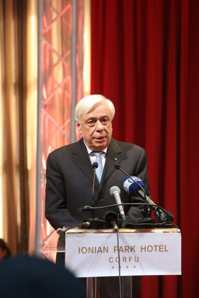 Ο Πρόεδρος της Δημοκρατίας Προκόπης Παυλόπουλος μιλά στην έναρξη των εργασιών του 1ου Διεθνούς Συνεδρίου Αποδήμων Ετανησίων που πραγματοποιείται στην Κέρκυρα, Πέμπτη 06 Σεπτεμβρίου 2018.Τον Πρόεδρο συνοδεύουν η σύζυγος του Βλασία και ο βετεράνος της ελληνικής διπλωματίας, πρώην υπουργός, Πέτρος Μολυβιάτης. Τον Πρόεδρο της Δημοκρατίας, που αναμένεται να κηρύξει την έναρξη των εργασιών του 1ου Διεθνούς Συνεδρίου Αποδήμων Επτανησίων, υποδέχθηκε ο περιφερειάρχης Ιονίων Νήσων Θεόδωρος Γαλιατσάτος και εκ μέρους της κυβέρνησης ο υφυπουργός Εξωτερικών, Τέρενς Κουίκ. ΑΠΕ-ΜΠΕ/ΑΠΕ-ΜΠΕ/ΚΑΤΑΠΟΔΗΣ ΣΤΑΜΑΤΗΣ