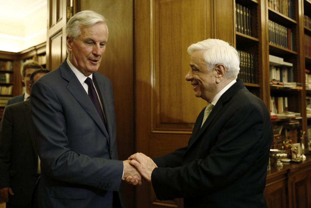 Ο Πρόεδρος της Δημοκρατίας Προκόπης Παυλόπουλος (Δ) υποδέχεται τον τ. Επίτροπο και Επικεφαλής Διαπραγματευτή της Ευρωπαϊκής Ένωσης, αρμοδίου για την προετοιμασία και την διεξαγωγή των διαπραγματεύσεων με το Ηνωμένο Βασίλειο Michel Barnier (Α) στο Προεδρικό Μέγαρο, Δευτέρα 20 Μαΐου 2019. ΑΠΕ ΜΠΕ/ΑΠΕ ΜΠΕ/ΑΛΕΞΑΝΔΡΟΣ ΒΛΑΧΟΣ