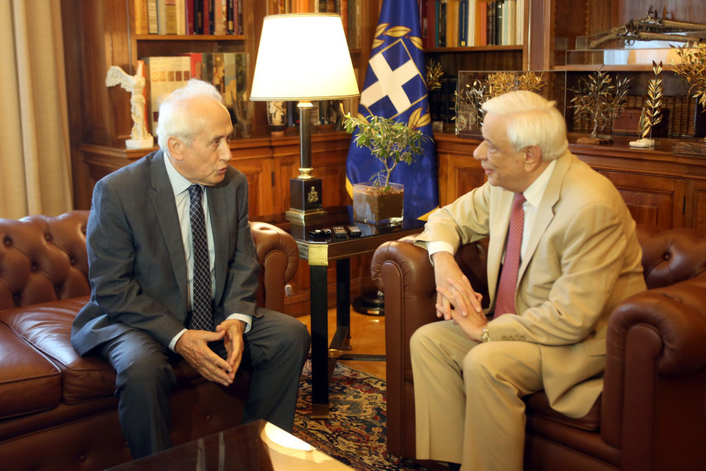 Ο Πρόεδρος της Δημοκρατίας Προκόπης Παυλόπουλος (Δ) συνομιλεί με τον υπουργό Εσωτερικών Αντώνη Ρουπακιώτη (Α) στη σημερινή τους συνάντηση στο Προεδρικό Μέγαρο, Παρασκευή 5 Ιουλίου 2019. Ο υπουργός Εσωτερικών Αντώνης Ρουπακιώτης ενημέρωσε τον Πρόεδρο της Δημοκρατίας για την εκλογική διαδικασία. ΑΠΕ-ΜΠΕ / ΑΠΕ-ΜΠΕ / ΑΛΕΞΑΝΔΡΟΣ ΜΠΕΛΤΕΣ