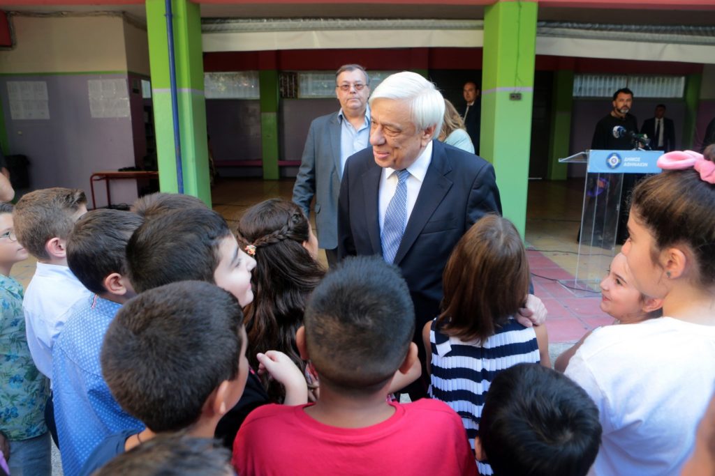 Ο Πρόεδρος της Δημοκρατιας Προκόπης Παυλόπουλος μιλά με μικρούς μαθητές και μαθήτριες στο 170ο και το 108ο Δημοτικό καθώς και στο 90ο και 108ο Νηπιαγωγείο για την τελετή Αγιασμού με την ευκαιρία έναρξης του νέου σχολικού έτους , Τετάρτη 11 Σεπτεμβρίου 2019. Πραγματοποιήθηκε στα σχολεία της χώρας η τελετή Αγιασμού με την ευκαιρία έναρξης του νέου σχολικού έτους. ΑΠΕ-ΜΠΕ/ΑΠΕ-ΜΠΕ/ΠΑΝΤΕΛΗΣ ΣΑΪΤΑΣ