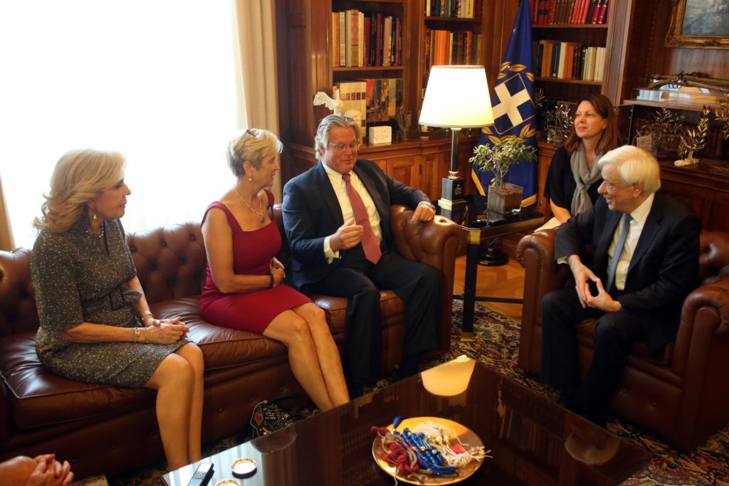 Ο Πρόεδρος της Δημοκρατίας Προκόπης Παυλόπουλος (1-Δ) μιλά με την πρόεδρο του Ιδρύματος Κένεντι Κέρυ Κένεντι (2-Α), τον σύζυγό της Τεντ (3-Α) και την Μαριάννα Βαρδινογιάννη (1-Α), στη σημερινή τους συνάντηση στο Προεδρικό Μέγαρο, Δευτέρα 7 Οκτωβρίου 2019. ΑΠΕ-ΜΠΕ/ΑΠΕ-ΜΠΕ/Αλέξανδρος Μπελτές