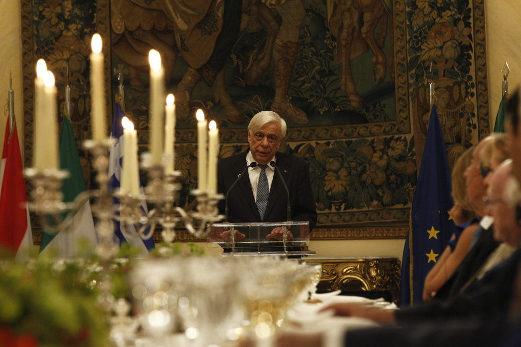 Ο Πρόεδρος της Δημοκρατίας Προκόπης (Κ) μιλάει στο επίσημο δείπνο που παραθέτει στο Προεδρικό Μέγαρο προς τιμήν των Μη Εκτελεστικών Προέδρων Κρατών, που συμμετέχουν στην 15η Άτυπη Σύνοδο των Αρχηγών Κρατών της «Ομάδος Αrraiolos».(της Βουλγαρίας, της Γερμανίας, της Εσθονίας, της Ιρλανδίας, της Ιταλίας, της Κροατίας, της Λετονίας, της Μάλτας, της Ουγγαρίας, της Πολωνίας, της Πορτογαλίας και της Σλοβενίας), Αθήνα, Παρασκευή 11 Οκτωβρίου 2019. ΑΠΕ ΜΠΕ/ΑΠΕ ΜΠΕ/ΑΛΕΞΑΝΔΡΟΣ ΒΛΑΧΟΣ