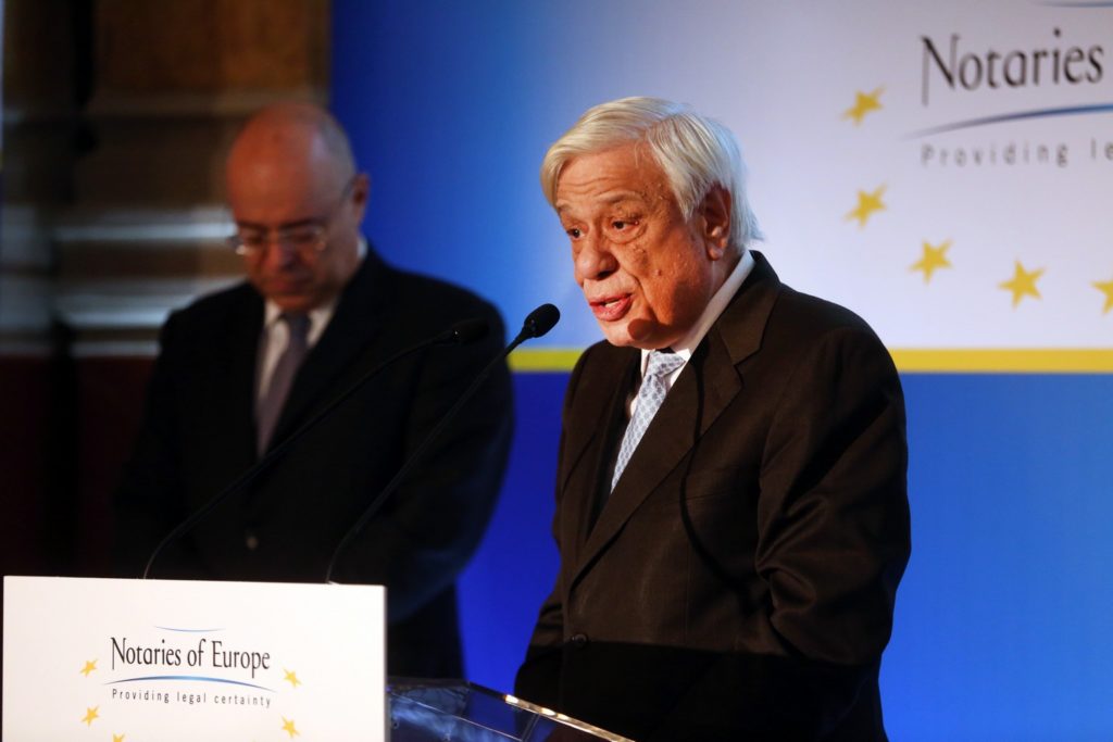 Βρίσκομαι εδώ σήμερα για ν’ αναδείξω τον ρόλο του Συμβολαιογράφου σ’ αυτούς τους δύσκολους καιρούς. Ο Πρόεδρος, κ.Γεώργιος Ρούσκας, με ευχαρίστησε για ορισμένα πράγματα που έκανα. Σας διαβεβαιώ ότι εσείς πράξατε το καθήκον σας σε μια πολύ κρίσιμη περίοδο για τον Τόπο. Δεν ξεχνώ, όχι μόνο λόγω της θεσμικής μου ιδιότητας, αλλά και λόγω της ακαδημαϊκής μου ιδιότητας, ότι ο Συμβολαιογράφος είναι Δημόσιος Λειτουργός, ασκεί Δημόσιο Λειτούργημα, ασκεί Δημόσια Υπηρεσία. Και αυτός είναι ο τρόπος που πρέπει να συμπεριφέρεται προς αυτόν και η Πολιτεία, αλλά και οι πολίτες. Έχουμε υποτιμήσει πολλές φορές την σημασία του ρόλου του Συμβολαιογράφου σε ό,τι αφορά τα δικαιώματα τα οποία θωρακίζει. Είναι πολλά τα δικαιώματα, δεν είναι μόνο το δικαίωμα στην ατομική ιδιοκτησία που είναι, ούτως ή άλλως, ένα Θεμελιώδες Δικαίωμα από το ίδιο το Σύνταγμά μας, από την ίδια την Ευρωπαϊκή Νομοθεσία αλλά – πρέπει να σας υπενθυμίσω – και από την Νομοθεσία του Συμβουλίου της Ευρώπης. Είναι εμβληματικό Δικαίωμα, πάνω στο οποίο βασίζεται η Αντιπροσωπευτική Δημοκρατία. Το ξέρετε όλοι ότι η Αντιπροσωπευτική Δημοκρατία στηρίζεται στα Θεμελιώδη Δικαιώματα του Ανθρώπου. Επιπλέον, η Αντιπροσωπευτική Δημοκρατία είχε ως αφετηρία την Αμερικανική Επανάσταση, με βάση το Θεμελιώδες Δικαίωμα της ατομικής ιδιοκτησίας. Όμως, εσείς ασκείτε καθήκοντα που υπερβαίνουν το δικαίωμα αυτό, αφορούν πολλά εμπράγματα και ενοχικά δικαιώματα. Τα υπερασπίζεσθε σε δύσκολους καιρούς, γιατί τα δικαιώματα αυτά βρίσκονται σε κρίση, σε κίνδυνο, και όχι μόνο στην χώρα μας, γενικότερα. Γνωρίζουμε όλοι – και θα το επαναλάβω και γι’ αυτό σας ευχαριστώ – σε μια πολύ κρίσιμη περίοδο, όταν η Ελλάδα περνούσε διαδοχικές κρίσεις και αξιολογήσεις από την πλευρά του Eurogroup ποιες ήταν οι προϋποθέσεις που είχαν τεθεί τότε για να μπορέσουμε να προχωρήσουμε. Και τότε αν δεν ήσασταν εσείς, ίσως μία από τις σημαντικότερες αξιολογήσεις δεν θα είχε ευνοϊκή κατάληξη. Το πράξατε στο ακέραιο, και το πράξατε χωρίς εκπτώσεις απέναντι στα Δικαιώματα του Ανθρώπου. Σταθήκατε στο ύψος των περιστάσεων, ως Δημόσιοι Λειτουργοί αλλά, ταυτοχρόνως, και ως Έλληνες Πολίτες. Έτσι παραμείναμε στην Ευρώπη, της οποίας είμαστε αναπόσπαστο μέλος για να μπορούμε να συμβάλουμε κι εμείς στην πορεία της Ευρώπης. Αλλά και να διεκδικούμε, όταν χρειάζεται, εκείνο που μας αναλογεί από την Ευρωπαϊκή μας Οικογένεια.