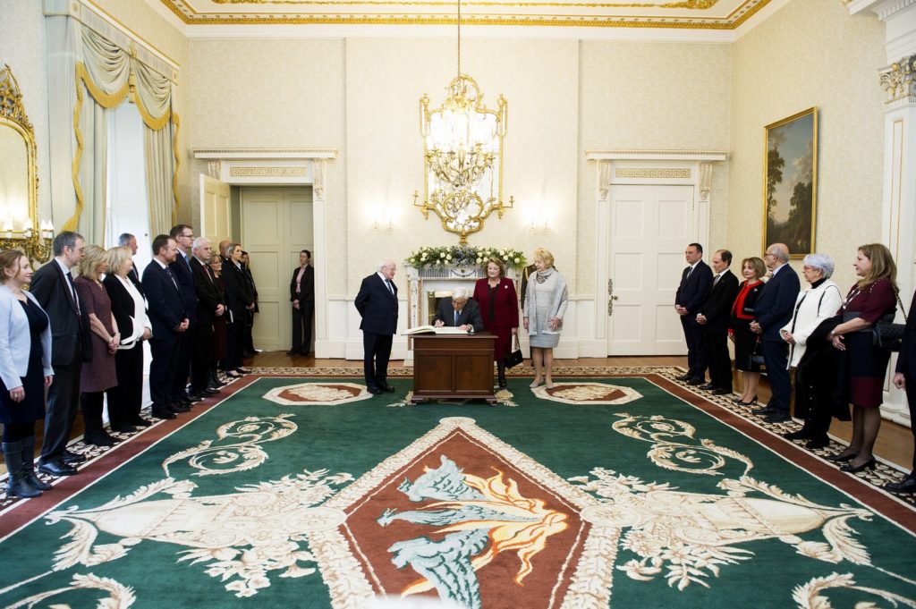 Αποτελεί για μένα ιδιαίτερη τιμή η επίσκεψή μου στην Ιρλανδία, πολλώ μάλλον επειδή πιστεύω ότι ο Λαός της Ιρλανδίας και ο Λαός της Ελλάδας μοιράζονται πολλά κοινά, καίτοι κατοικούν στις δύο άκρες της Ευρώπης. Στέκομαι μόνο στα εξής: Ελλάδα και Ιρλανδία είναι δύο μικρές εδαφικώς και πληθυσμιακώς Χώρες, οι οποίες όμως διαθέτουν μια Διασπορά που ξεπερνά, κατά πολύ, το μέγεθός τους, ενώ οι Πολίτες τους δεν μπορούν να ζήσουν παρά μόνον Ελεύθεροι και υπό καθεστώς Δημοκρατίας. Με άλλες λέξεις, για τους Λαούς μας η Ελευθερία και η Δημοκρατία, άρα η υπεράσπιση των Θεμελιωδών Δικαιωμάτων του Ανθρώπου, είναι αρχές και αξίες βιωματικές και υπαρξιακές.
