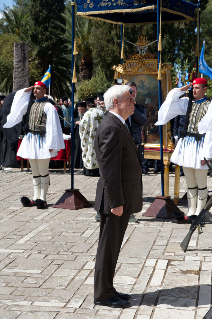 Ο Πρόεδρος της Δημοκρατίας, Προκόπης Παυλόπουλος (Κ), παρευρέθη στις εορταστικές εκδηλώσεις για την 192η επέτειο της Εξόδου της Ηρωϊκής Φρουράς, στο Μεσολόγγι, Κυριακή 1η Απριλίου 2018. Ο Πρόεδρος της Δημοκρατίας παρέστη στη δοξολογία που τελέστηκε στον μητροπολιτικό ναό του Αγίου Σπυρίδωνος και εν συνεχεία παρακολούθησε την παρέλαση. Κατόπιν, μετέβη στον Κήπο των Ηρώων, όπου τελέστηκε τρισάγιο και ακολούθησε κατάθεση στεφάνου. ΑΠΕ-ΜΠΕ/ ΑΠΕ-ΜΠΕ/ STR