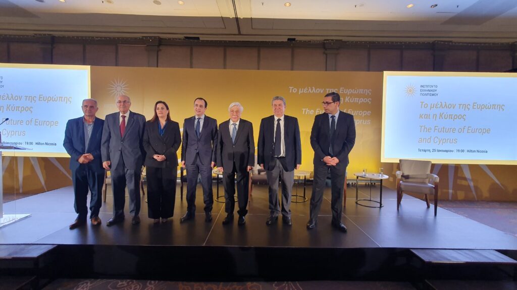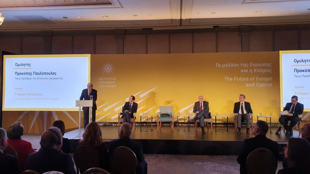 Στο πλαίσιο της εκδήλωσης του Ινστιτούτου Ελληνικού Πολιτισμού με θέμα «Το Μέλλον της Ευρώπης και η Κύπρος», ο κ. Παυλόπουλος μίλησε με θέμα «Το υπαρξιακό διακύβευμα της Ευρωπαϊκής Ενοποίησης υπό τα «καυδιανά δίκρανα» της τρέχουσας κρίσιμης διεθνούς συγκυρίας. Επισήμανε δε, μεταξύ άλλων και τα εξής: