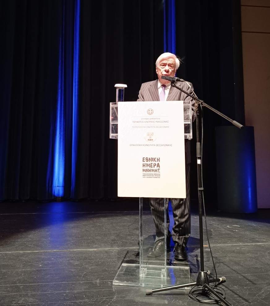 Με αισθήματα ύψιστης τιμής και ανείπωτης συγκίνησης βρίσκομαι σήμερα εδώ, μαζί σας, κατά την Ημέρα Μνήμης των Ελλήνων Εβραίων Μαρτύρων και Ηρώων του Ολοκαυτώματος αποτίοντας, για μιαν ακόμη φορά, τον οφειλόμενο φόρο τιμής στην Ιερή Μνήμη των Συμπατριωτών μας Εβραίων της Θεσσαλονίκης, τραγικών θυμάτων του Ολοκαυτώματος. Και η συγκίνησή μου αυτή εντείνεται περισσότερο όταν γυρίζω πίσω στον χρόνο για να θυμηθώ ότι ως Πρόεδρος της Δημοκρατίας υπέγραψα, την 29η Δεκεμβρίου 2017, το διάταγμα για την ανέγερση του εμβληματικού Εβραϊκού Μουσείου Ολοκαυτώματος, του δεύτερου από πλευράς μεγέθους και συμβολισμών Μουσείου αυτής της μορφής παγκοσμίως. Το οποίο σύντομα θα ολοκληρωθεί και θα εκπέμπει ακτινοβολία μνήμης και διδαχής, προκειμένου να μας καθοδηγεί ως φάρος εκπλήρωσης ενός αυτονόητου και διαχρονικού χρέους απέναντι στον Άνθρωπο και στην Ανθρωπότητα, όπως θα εκθέσω στην συνέχεια διεξοδικότερα.